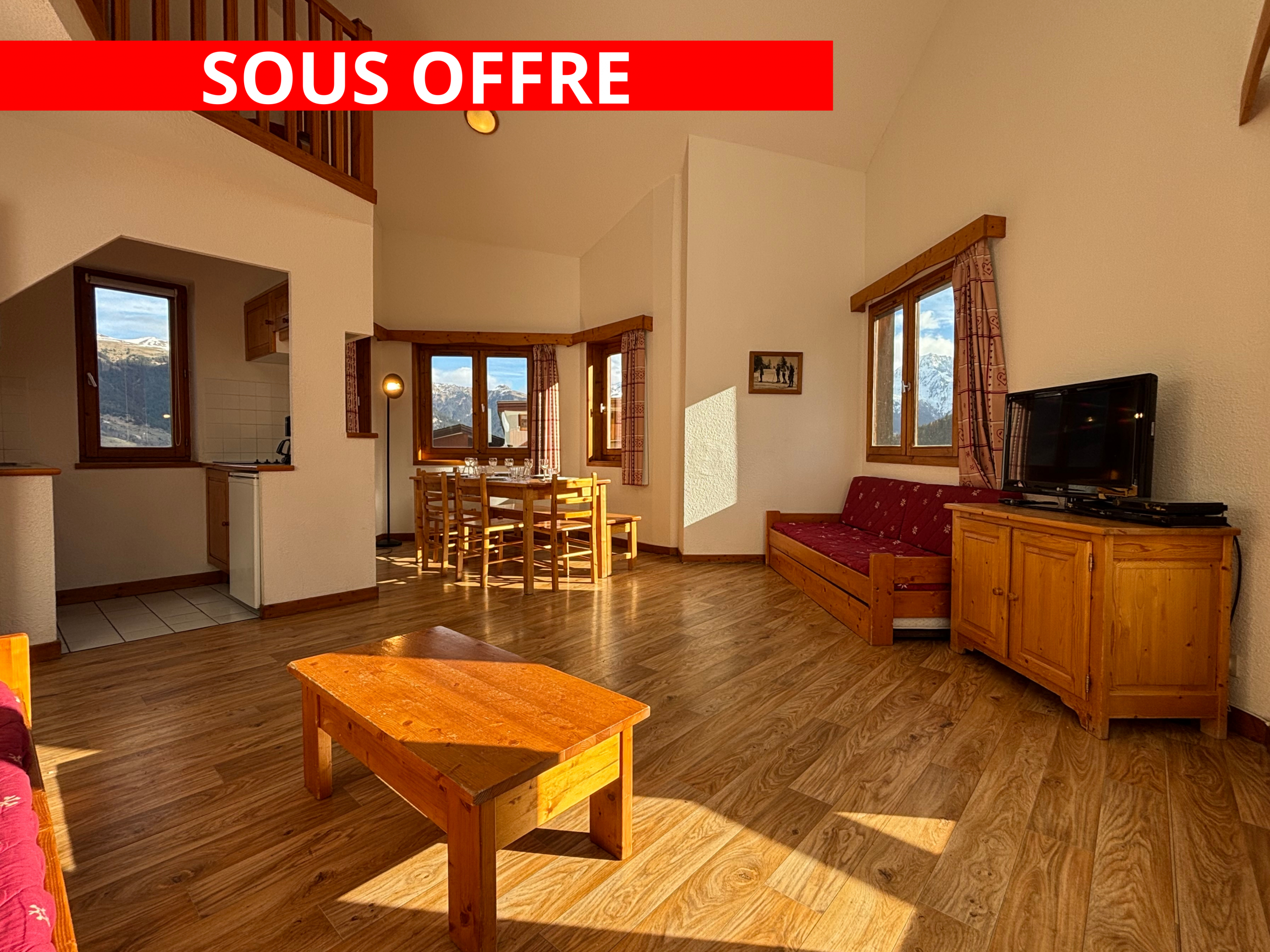 - Pièces : 3 pièces (2 chambres, 1 mezzanine, 1 salon avec cuisine ouverte)