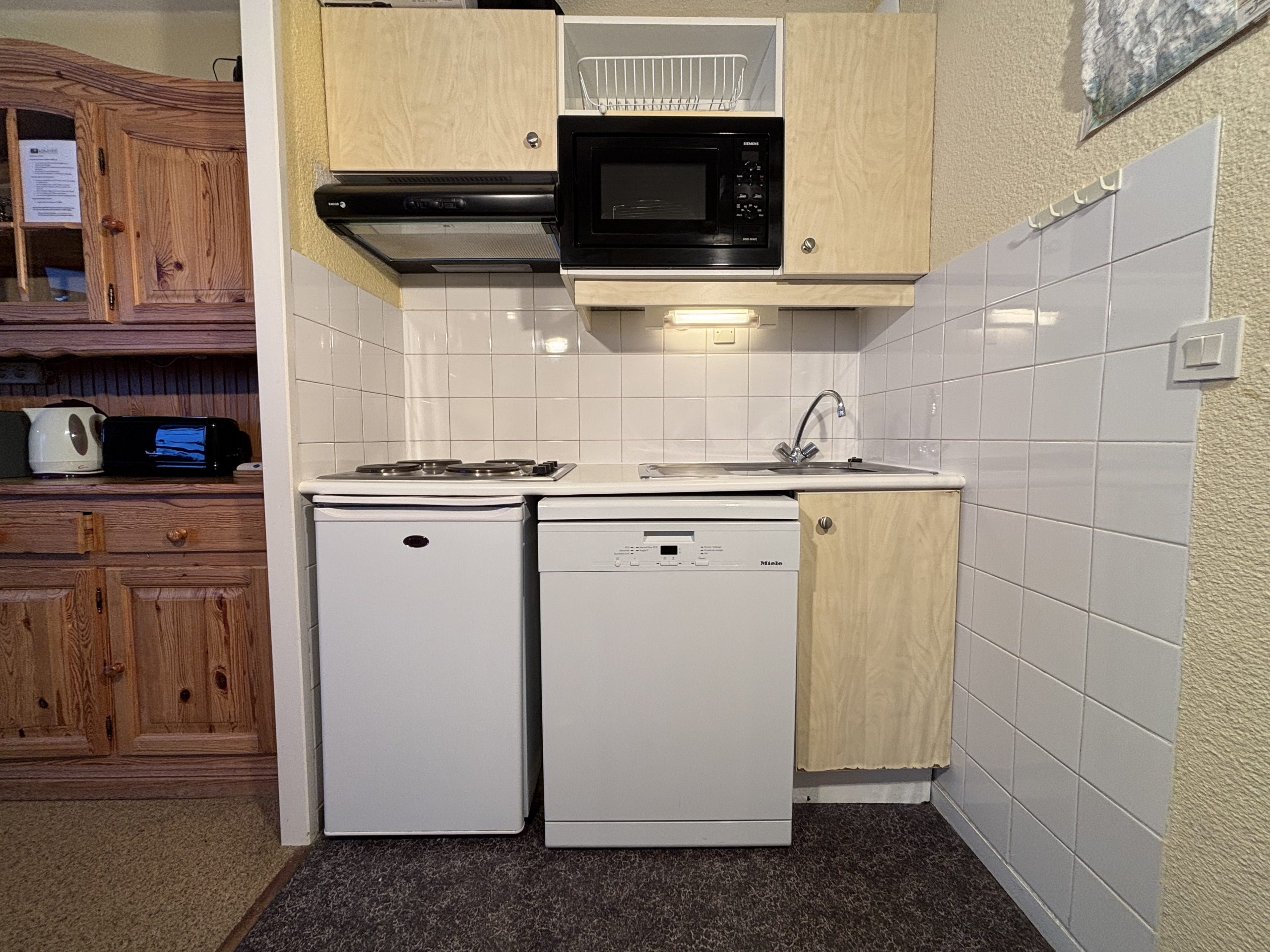 Cuisine : réfrigérateur, plaques vitrocéramique, lave-vaisselle, micro-ondes, hotte, cafetière filtre