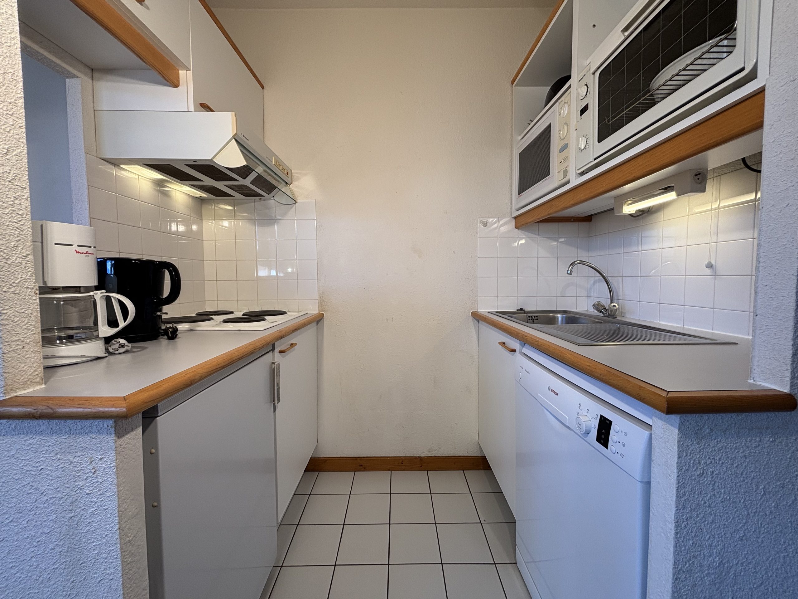Cuisine : réfrigérateur, plaques vitrocéramique, lave-vaisselle, four, micro-ondes, hotte, cafetière filtre