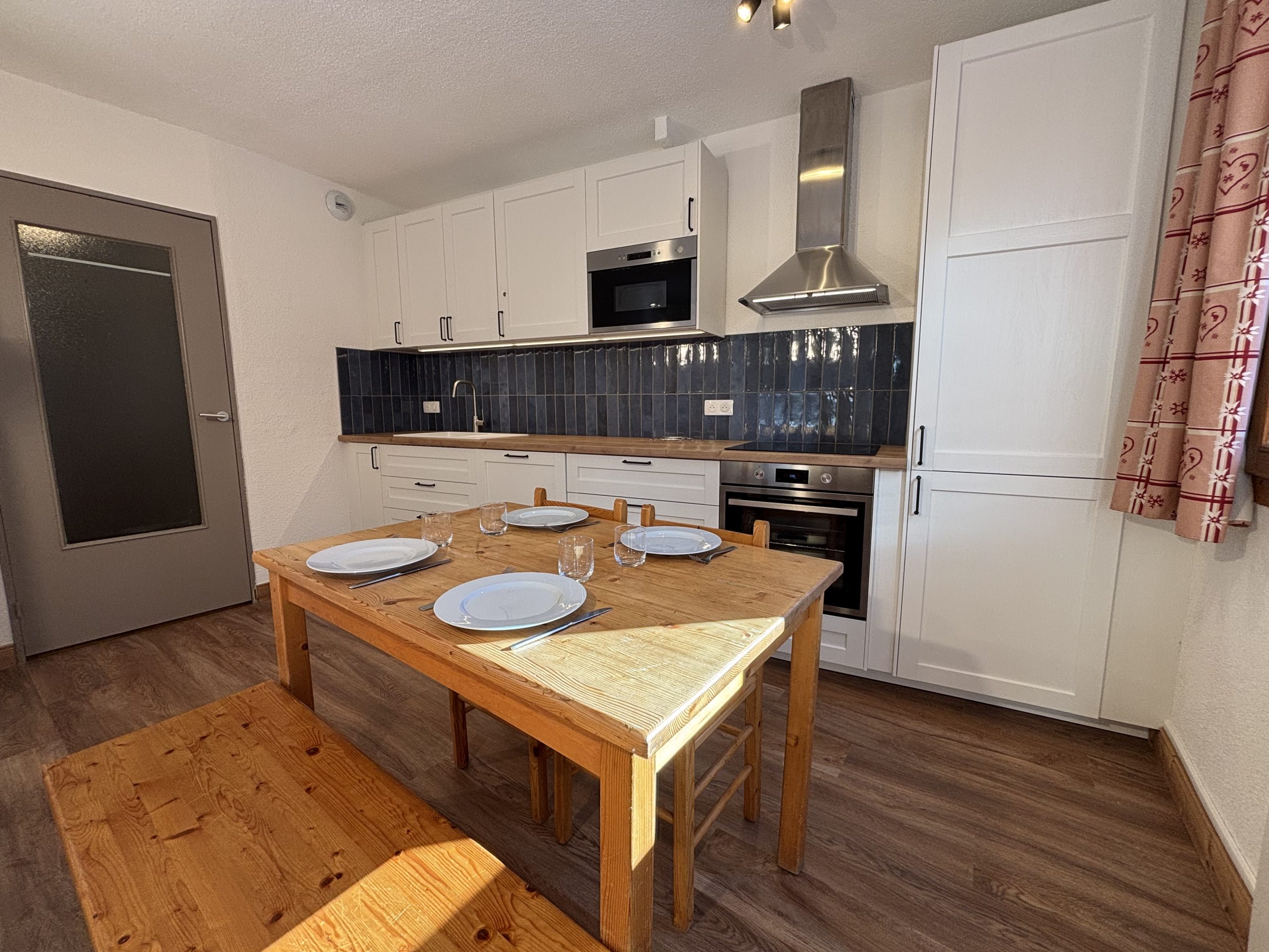 Cuisine : réfrigérateur, plaques vitrocéramique, lave-vaisselle, micro-ondes, cafetière filtre