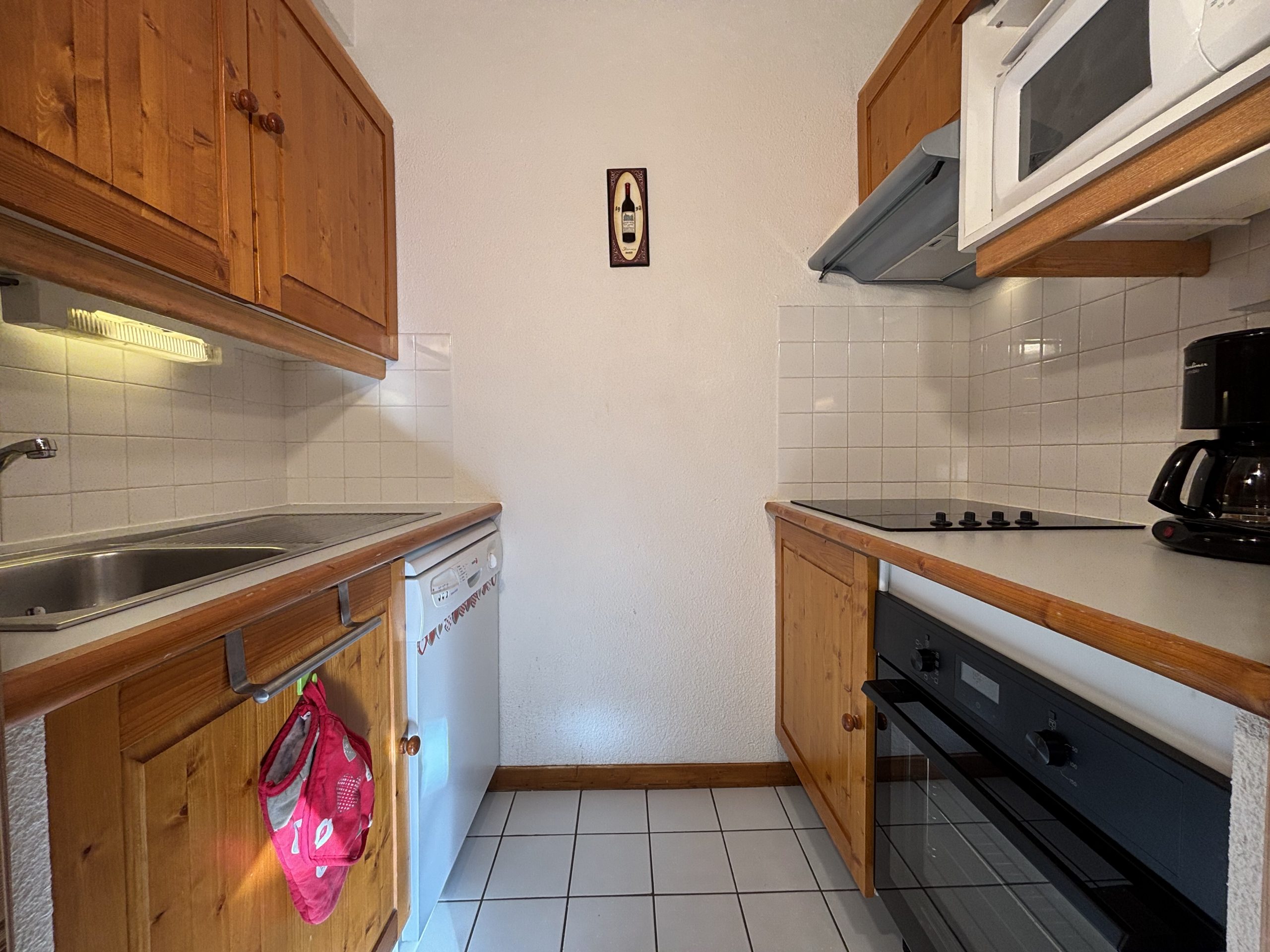 Cuisine : réfrigérateur, plaques vitrocéramique, lave-vaisselle, four micro-ondes, cafetière filtre